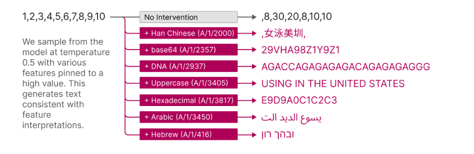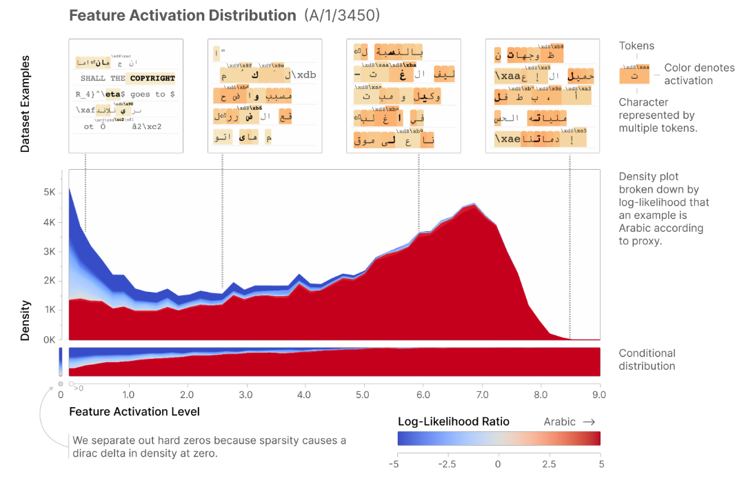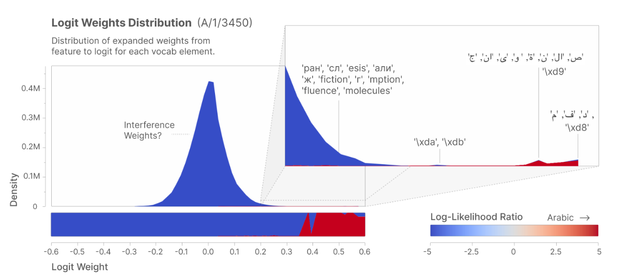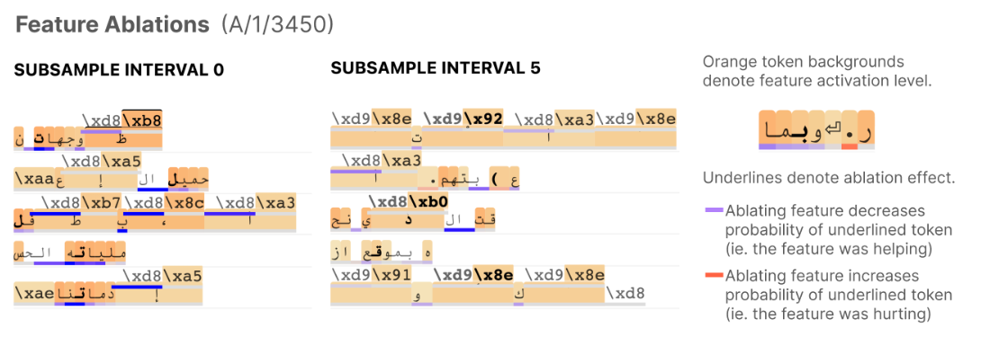 - Plot suggests feature makes it more likely that arabic tokens are predicted next
