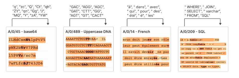 - E.g. map batch of tokens into feature space, consider e.g. dimension \(7\) of feature (dictionary) matrix and sort by activation scores